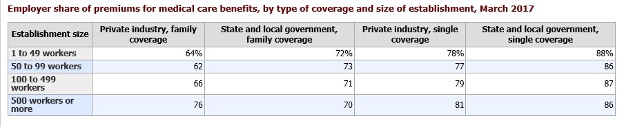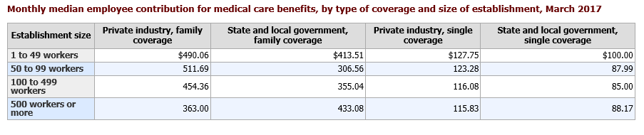 Historically, the industry trend for government organizations is to pay a larger share of the medical premium cost for their employees. Last calendar year was no exception. Below are charts provided by the US DOL to give employers insight into prior year premium averages. Further information can be found at: